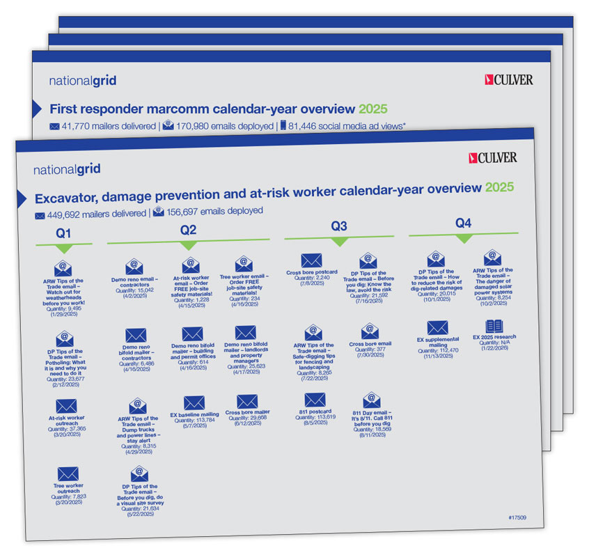 The Stakeholder engagement timeline provides a quarterly view of National Grid’s annual public safety outreach activities with Culver Company. The document details the timing and reach of communications – including emails, mailings and ads – to at-risk audiences, including excavators, workers, schools, first responders, emergency officials, public officials and more. Additional activities included on the timeline are research reports, employee stakeholder engagement newsletters and the annual report.