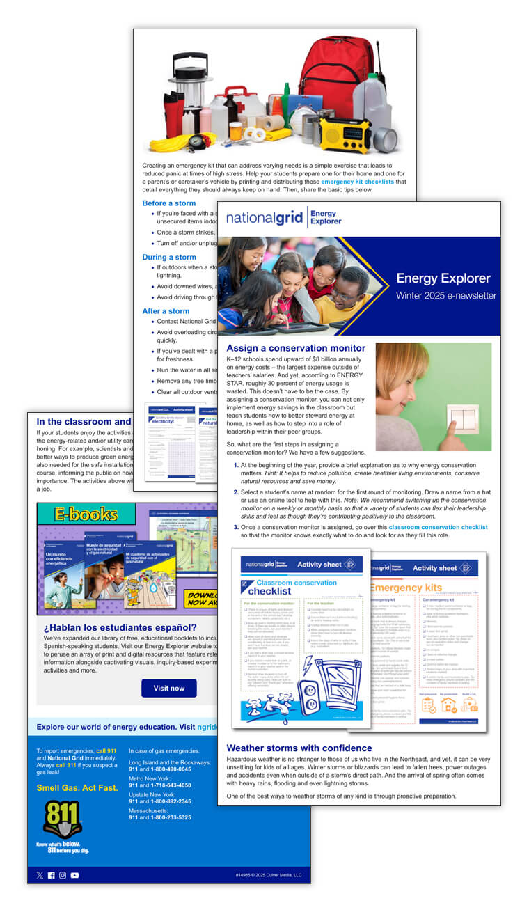 An informational e-newsletter distributed to K–8 educators in National Grid’s service area. This issue focused on assigning a conservation monitor in the classroom, weathering hazardous storms, discussing energy‑related and/or utility careers with students, and additional resources for Spanish-speaking students on the Energy Explorer website. Also included were links to a classroom conservation checklist, emergency kit checklists for the home and car, and age‑appropriate activity sheets about electricity and natural gas.